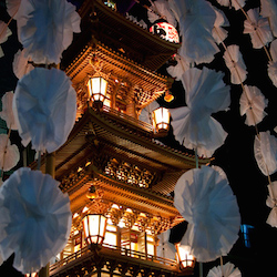These floats, carried to the temple by 3,000 happi coat-wearing devotees from all over the country, are constructed to give the appearance of a five story pagoda, iridescently lit from the inside. These are adorned with artificial cherry blossom branches, cascading from the top in an umbrella pattern, reflecting the pagoda light, giving it the form of an ethereal sakura tree, a representation of the blossom that reflected the final celestial light of Nichiren as he left the mortal world.