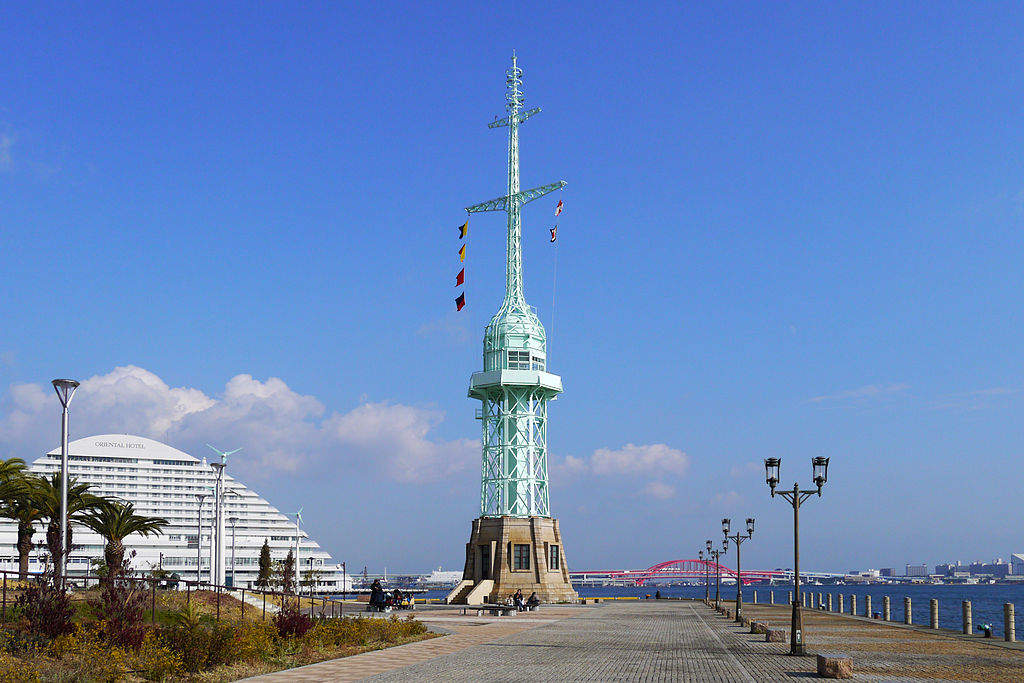 The most photographed historic navigation aids in the city are perched in Kobe Harborland. Old Shinko No. 5 Pier Signal Tower rises 46.3 meters from a handsome rusticated stone base to display flags that guided ships in and out of the harbor. The flags represent Kobe to incoming ships and also prayers for those vessels heading out to sea. When it was constructed in 1921, the signal tower was hailed as the finest in all of Asia; it continued at its post until 1990. Also at Harborland is the red-capped Mosaic Watch Tower that watched over cargo ships coming to dock beginning in 1914.