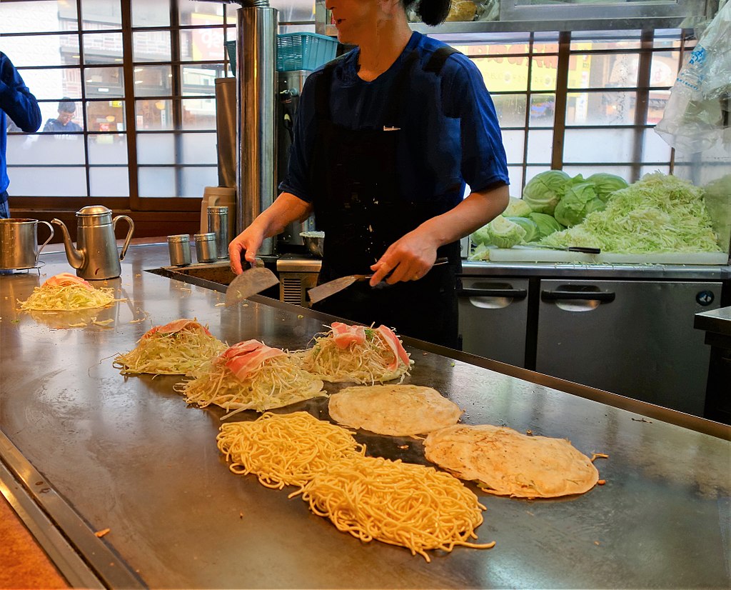 Another okonomiyaki restaurant close to Peace Park, Nagataya, is a popular eatery and often has queues outside at busy times. It has ample space inside where you can order the house special of pork, squid, and shrimp with soba or udon noodles topped with green onions and an egg. Teppanyaki dishes are also on the menu, including buttered oysters with lemon and green onions.