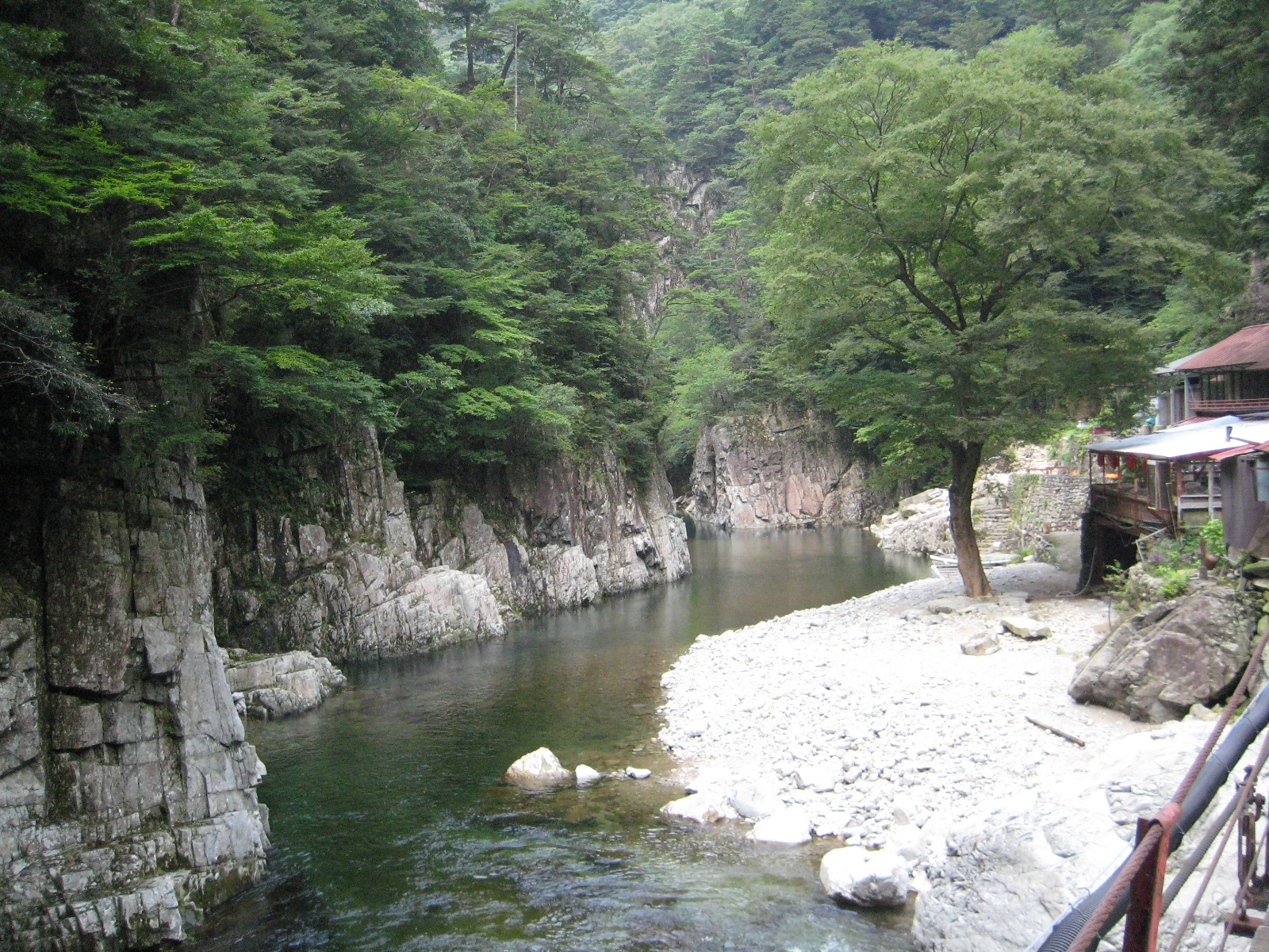 The out-and-back trail (actually, much of the track surface is rough concrete) is very clear and it is very difficult to get lost. Although the path does undulate, is very doable for anyone with a reasonable level of fitness. The main goal for most is Sandan-daki, the three-tier waterfall for which the gorge is named, and which ambition makes the hike a full day commitment. One of the most popular walking trails is a round-trip that begins at the Sandan-kyō front gate with the lovely Kurofuchi pool as the turning point. The hike only takes about an hour each way and is not overly strenuous. The Kurofuchi pool is known for its emerald green water and it is possible to take a short ferry ride across it to a restaurant on the far bank. On this route, you will also see the stunning Shimai waterfall and Ishidoi rapids.