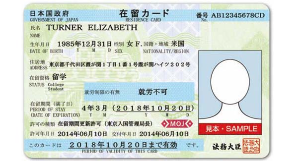 You will receive this at the airport when you arrive. This card functions as your primary ID in Japan and proves that you are legally authorized to live here. You must carry this card on you all at times and may even be asked to show it to police officers. You must also take this card with you when exiting and entering the country. When you leave Japan at the end of your assignment, please turn it in at the airport.