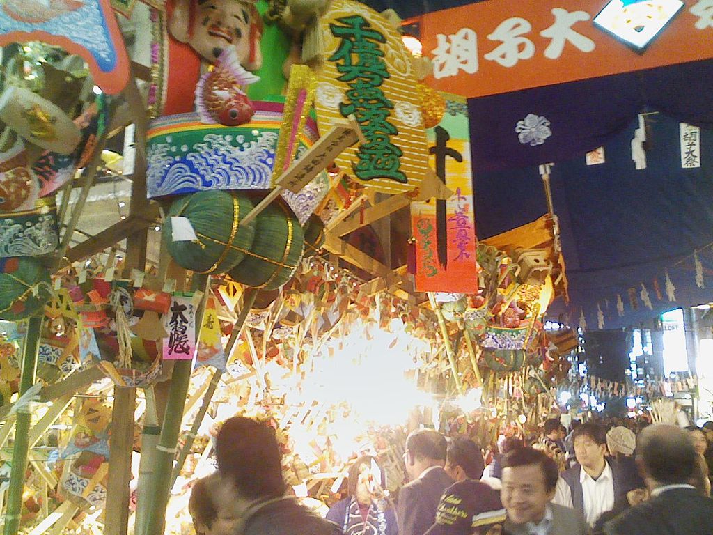 In front of the shrine itself, you’ll find a large wooden barrel that slowly fills with cash over the course of the festival, as people lob coins, thousand yen bills and even the odd ten thousand yen in to offer thanks and ask for continued fortune in the coming year. Since 1901, the festival has also been known for selling ‘komazarae.’ These are bamboo rakes, in all different sizes, decorated with gold coins, treasure ships and other talismans meant to attract money. Some even say the rake form itself is intended to “rake in” the cash. Wherever you go in Hiroshima, you’ll spot these hung over the doors and behind the counters of restaurants and izakaya all over town.