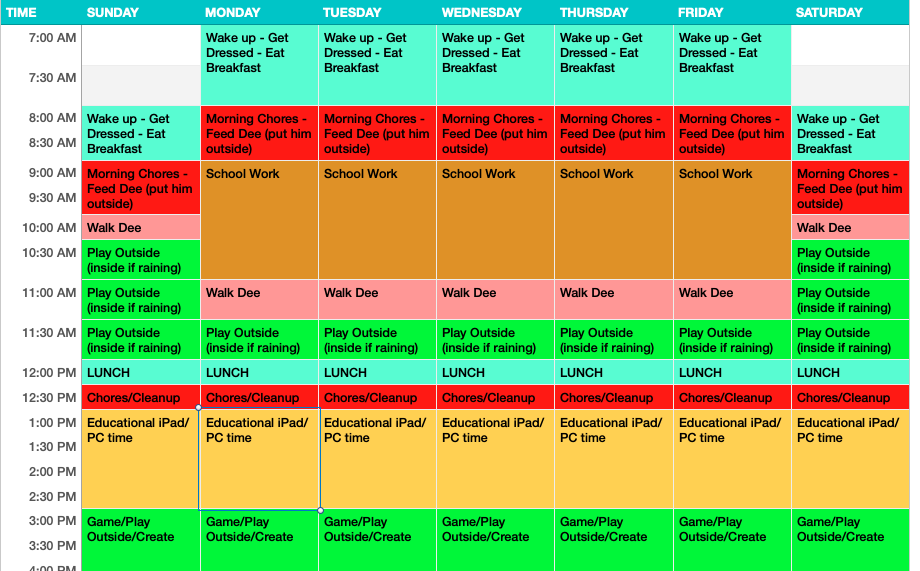 Speaking as both an educator and a parent here, I can say without a doubt that the ability to keep some sense of a regular structured schedule is key to making everyone feel less stressed and able to adapt to the other changes. I asked my little ones about their daily school schedules to get an idea of what time they have recess, how long quiet time is, how many times a week they allow for each subject and the like. I then tried as best as possible to make a similar schedule for their daily study time while being at home. I think the most important time on our chart is “go outside and play in the backyard” and “walk the dog” times. They normally would be outside playing, taking P.E., walking to and from school after all, so it’s still very important for them to have some fresh air.