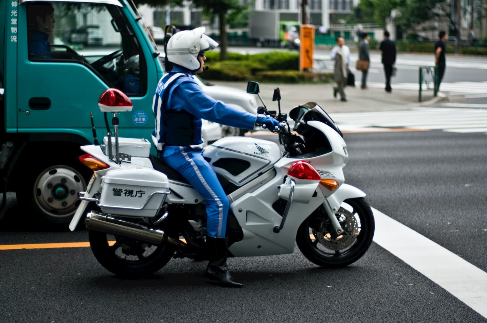 Unlike in the US, and many other places, police ride in their vehicles with their lights on to show they’re on patrol, and off when they are doing other work. When they want you to pull over, they will use their loudspeaker and tell you, or simply pull next to you and motion for you to do so. Sometimes an officer on the street will wave a baton and do this; once I saw a cop on bicycle calmly ride into the middle of slow traffic and usher a motorist to the side of the street. In all cases, you are to of course stop your vehicle and talk to the officer.