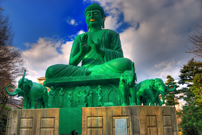 Decorated in vivid green and gold, the Buddha towers over the leafy Motoyama suburb, but it is not the sole reason to visit Toganji. With links to Indian high priests, the temple features a Shiva-Lingam and a shrine dedicated to the Goddess Saraswati, the Hindu goddess of knowledge, music, and art. The small grounds are beautifully tended.