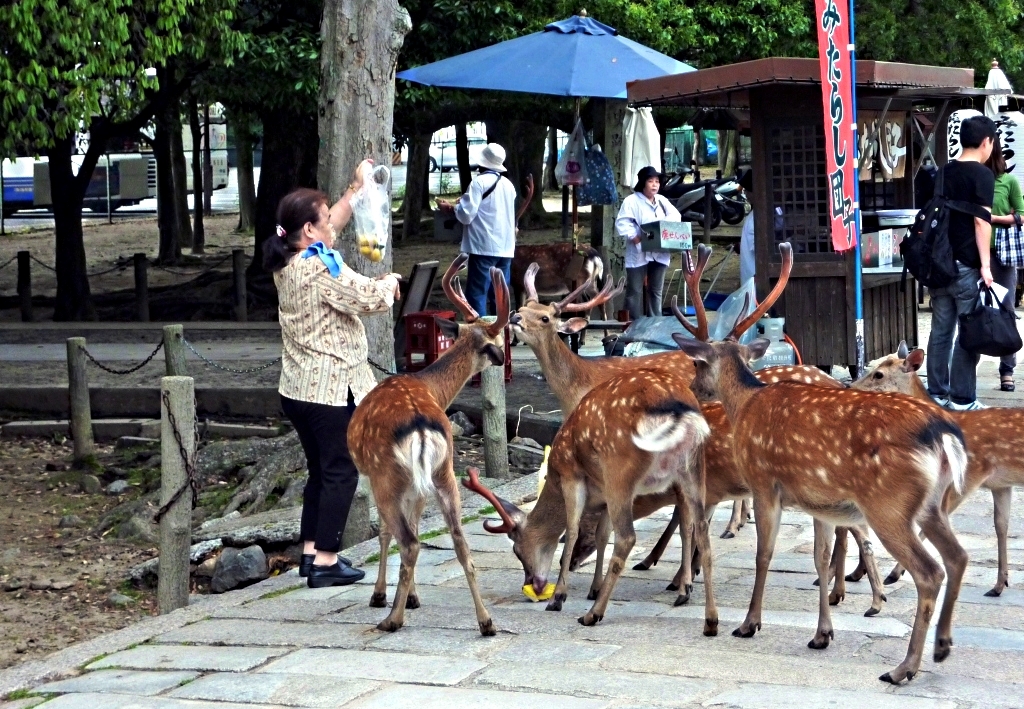 Not in Nara. The Nara herd numbers about 1,200 animals. Their main hangout is Nara Park where the mostly tame creatures enjoy handouts of “deer crackers” from tourists that can be purchased for that purpose. The deer roam free and it is not unusual to see them spill out in to the surrounding roadways where they wander among traffic and relax in the medians.