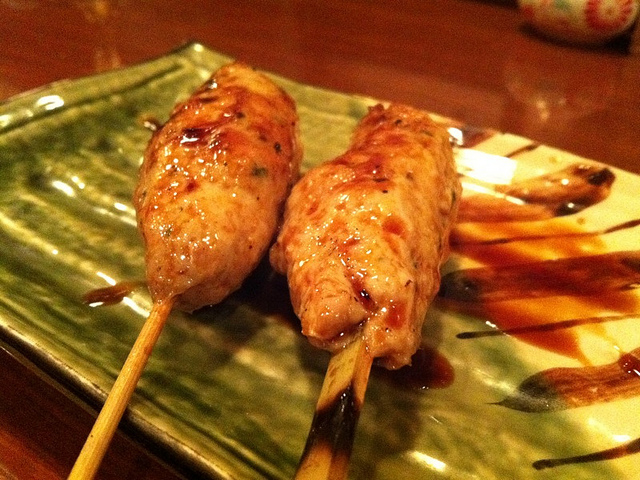 Perhaps best described as chicken meatballs on sticks, tsukune is a standard staple of the yakitori-ya. However, some places do it better than others, and at worst it can be a bit bland and preformed. But when done correctly, especially made by hand and stuffed with shiso leaves, it will be the best dish on the menu.