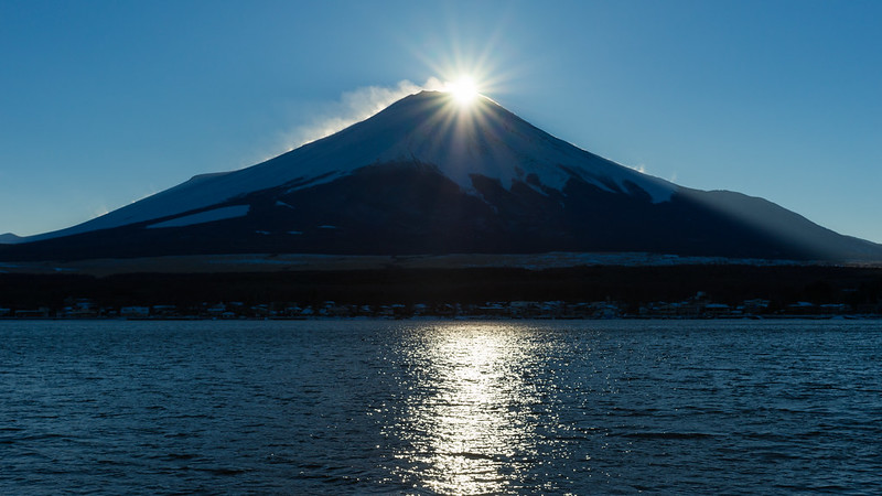 For more lakeside viewing, you could head to the Yamanakako Water Park. While it will still be a bit too chilly to engage in any water sports there, the tranquil lake provides another excellent opportunity for viewing the ‘Double Diamond’ effect. There is an observation deck at the lakeside with a telescope, but it goes without saying that the telescope is not to be used to look at the sunset. Not if you want to keep your retinas, that is.