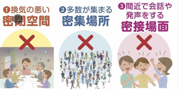 While the “lockdowns” that are seen in many countries are currently impossible to put into effect in Japan because of how the laws are interpreted, it is still up the upmost importance to follow the recently unveiled San Mitsu Rules (三密対策) and avoid the following: