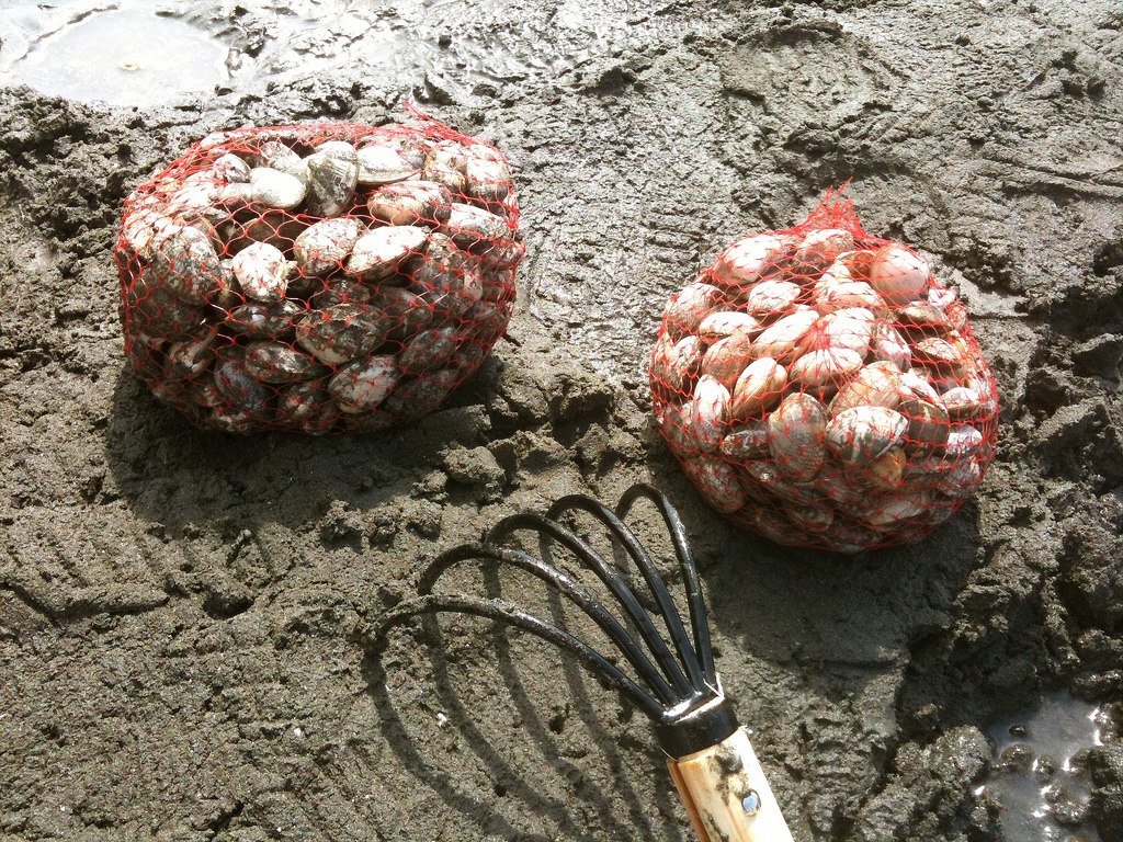 The clams are usually buried out of sight at least two centimeters below the surface, so you have to uncover the shells using the kumade. One clue as to whether a clam is hiding underfoot is by examining the surface for small holes, though it is best to stick to where the mud is flat, as this indicates that someone else has not harvested the ground. Perhaps the best way to do it is to dig shallow and wide rather than deep. Then, once you have uncovered your prey, scoop it out by hand and drop it into your salt water-filled bucket to keep the clams alive and shells closed.