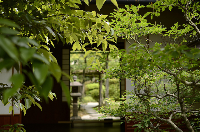 Designated a National Treasure in 1936, Teahouse Joan was designed by Oda Urakusai, younger brother to the warrior Nobunaga, and was first built in Kyoto in 1618 in the grounds of the Kyoto temple Kennin-ji. Urakusai, a great enthusiast for the tea ceremony who would renounce his own violent past, was a disciple of Sen no Rikyu, Japan’s most famous tea ceremony master, and in accordance with the strict rites and aesthetics of the Tea Ceremony, the teahouse is of a simple design. It has low, wooden shingle roofs and clay-clad bamboo lattices, and peering inside you can see a number of unique ‘fusuma’ paper sliding doors, as well as an ancient lunar calendar. Classic, elegent, strikingly simple, it is considered by many to be a masterpiece of teahouse architecture, and one of Japan’s three finest teahouses.